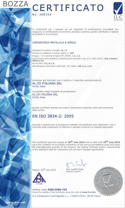 Garanzia dell’alto livello del lavoro della carpenteria sono le certificazioni ottenute dall’azienda. Nello specifico, ISO 3834, Certificazione UNI EN 1090, Iscrizione a “WHITE LIST” per Imprese. Affidandovi a Noi avrete la certezza di ricevere lavorazioni delle lamiere e altri lavori di carpenteria sempre a regola d’arte, nel rispetto di tutte le normative di legge vigenti nel settore.